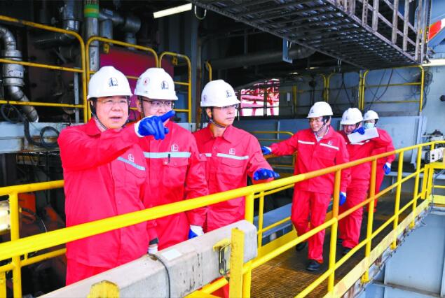 8月30日,马永生在海洋石油工程公司勘探七号平台调研。记者 章铮 王汝鹏 摄影报道