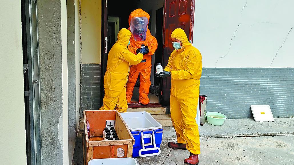 9月7日,中国石化中原普光应急救援中心(国家危化品救援普光队)抵达震中泸定县展开危化品救援。图为身着防化服的救援队员从某受损科研场所内小心翼翼地抢出酸性危化品。