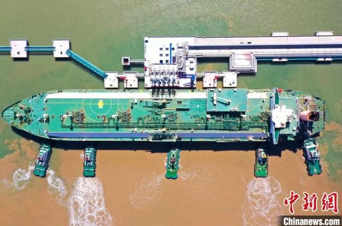 9月26日,经过16天6000海里的航行,来自卡塔尔的“阿尔卡莎米亚”号液化天然气运输船抵达江苏盐城。中国海油董事长汪东进表示,中国规模最大的液化天然气储备基地——中国海油盐城“绿能港”开始接卸首船液化天然气,标志着该项目实现投产。26日,在5艘拖轮的牵引下,容量21万立方米的超大型液化天然气运输船“阿尔卡莎米亚”号缓缓靠近码头,5根高达36米的卸料臂调好角度,精准对接,船上的液化天然气由此输送到“绿能港”3号储罐中储存。据了解,该储罐是国内首个正式投用的22万立方米液化天然气储罐,21万立方米液化天然气气化后达1.3亿立方米,可供650万户家庭1个月的生活使用。