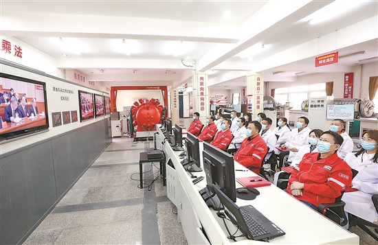 辽河油田国家稠(重)油研发试验中心员工观看开幕会直播。 陈允长 摄