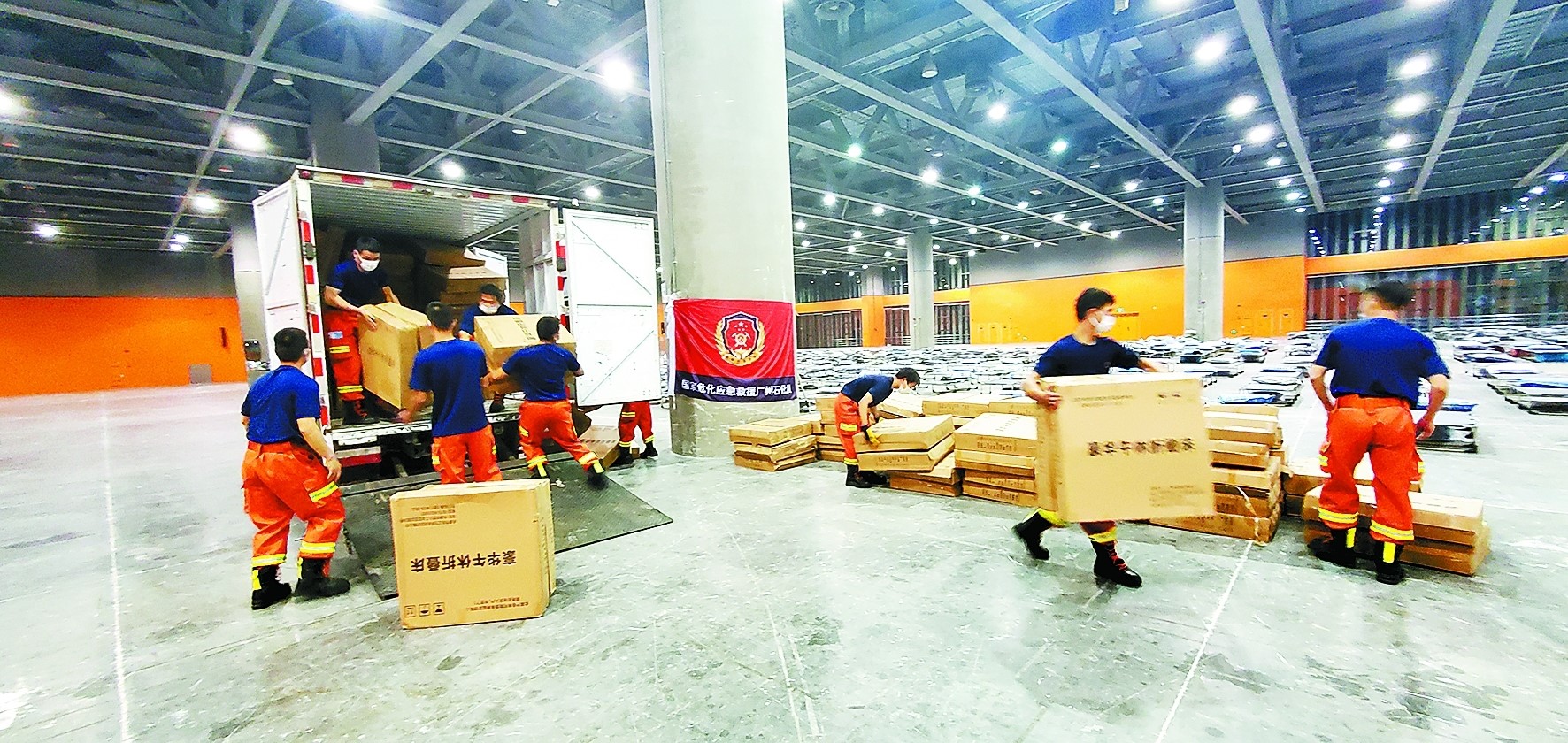 11月16日,在广州疫情防控关键时刻,广州石化组织由消防支队17名队员组成的突击队,赶赴海珠区琶洲方舱医院,连续奋战12个小时,辗转多个场馆,完成了转运搭建铺设12000张床位、7000套被褥被套的任务,彰显了央企责任担当。图为突击队员在方舱医院搬卸物资。张凯摄黄敏清文