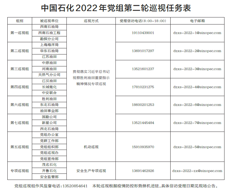 中国石化集团公司召开2022年党组第二轮巡视动员部署会,深入学习贯彻党的二十大精神和习近平总书记关于巡视工作重要论述,动员部署党组第二轮巡视工作,马永生要求,切实把党的二十大精神落实到巡视工作实践之中[中国石化新闻网2022-11-21]11月18日,中国石化集团公司召开2022年党组第二轮巡视动员部署会,深入学习贯彻党的二十大精神,认真贯彻落实习近平总书记关于巡视工作重要论述,总结党组今年第一轮巡视工作,通报共性典型问题,对高质量推进党组第二轮巡视进行动员部署。集团公司党组书记、董事长、党组巡视工作领导小组组长马永生强调,要更加紧密团结在以习近平同志为核心的党中央周围,大力发扬自我革命精神,保持永远在路上的定力,坚定不移把全面从严治党向纵深推进,以强有力巡视监督为公司高质量发展保驾护航,为建设具有强大战略支撑力、强大民生保障力、强大精神感召力的中国石化提供坚强保证。