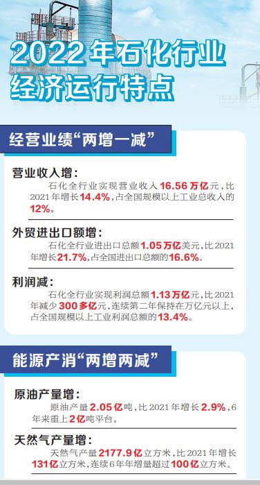 2022年石化全行业营业收入比上年增长14.4%、进出口总额比上年增长21.7%,两项指标均创历史纪录;利润总额虽然下降2.8%,但总量仍保持在1.1万亿元以上。