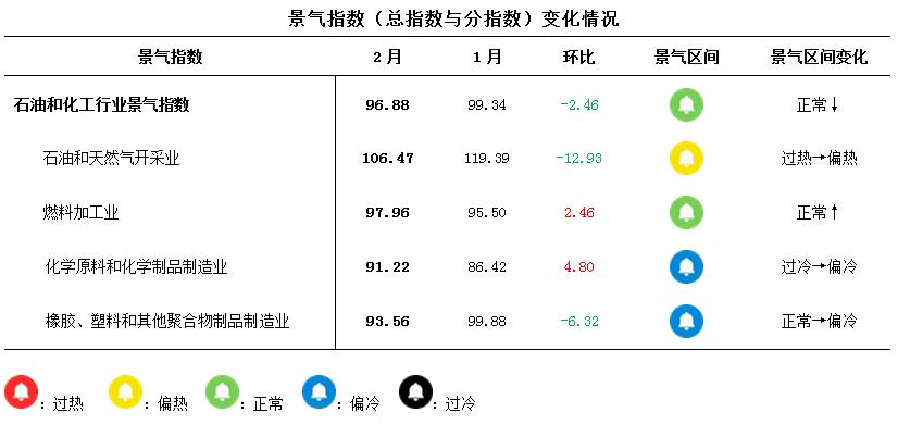2023年2月石油和化工行业景气指数回调,降至96.88,较2023年1月下降2.46个百分点,仍处正常区间;较2022年2月下降4.46个百分点,降幅延续收窄趋势。