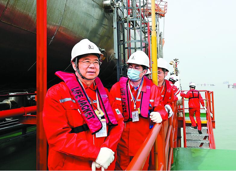 3月17日,马永生在胜利油田海洋采油厂中心一号平台现场调研。记者程阳王国章摄影报道