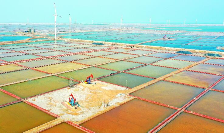 胜利油田认真贯彻落实习近平总书记关于黄河流域生态保护的重要指示精神,制定黄河口油气勘探开发生态保护差异化管理办法,实施油水井站提标改造工程和风险隐患排查治理行动,实现了油气开采全过程清洁生产,有力守护母亲河更安澜更健康更美丽。图为五号桩区块与周边盐田形成一幅和谐优美的生态画卷。王国章摄
