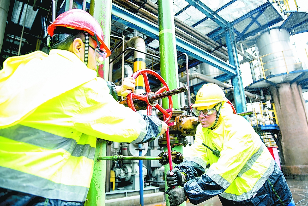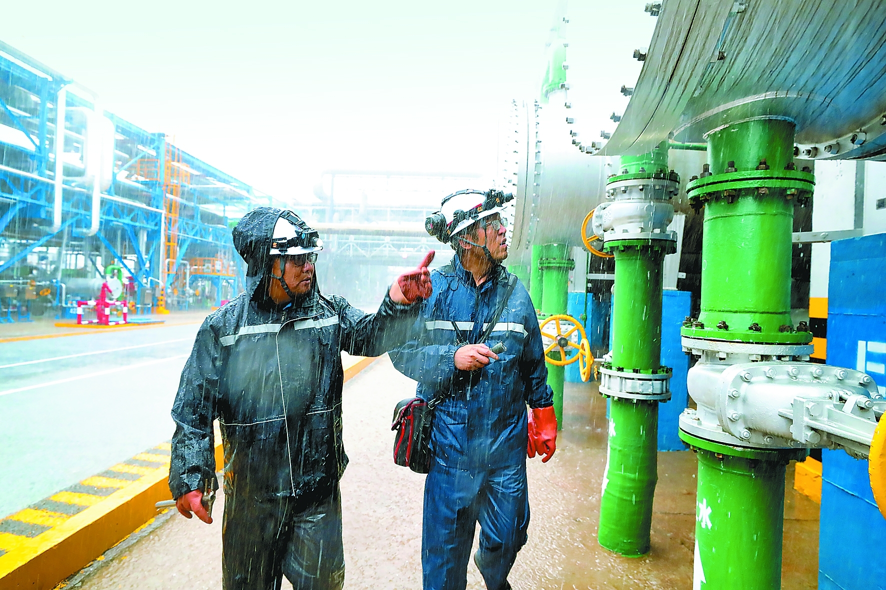 7月31日天津石化炼油部员工在雨中调整生产工艺流程。董波 摄 胡玉华 文