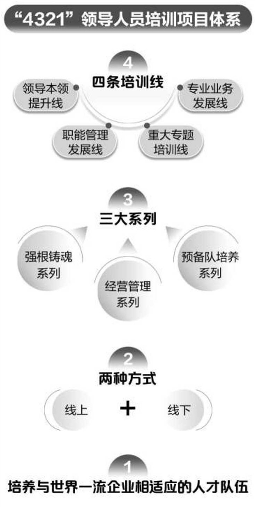 学院紧密结合集团公司发展战略和“三强”干部培养需要,积极构建适应集团公司发展要求、具有自身特色的国企领导人员和经营管理人员培训体系,“4321”领导人员培训项目、“1+5+N”培训课程、培训运营管理、培训资源四大子体系互相支持、深度融合、互相促进,形成学院最重要的能力和最核心的竞争力。