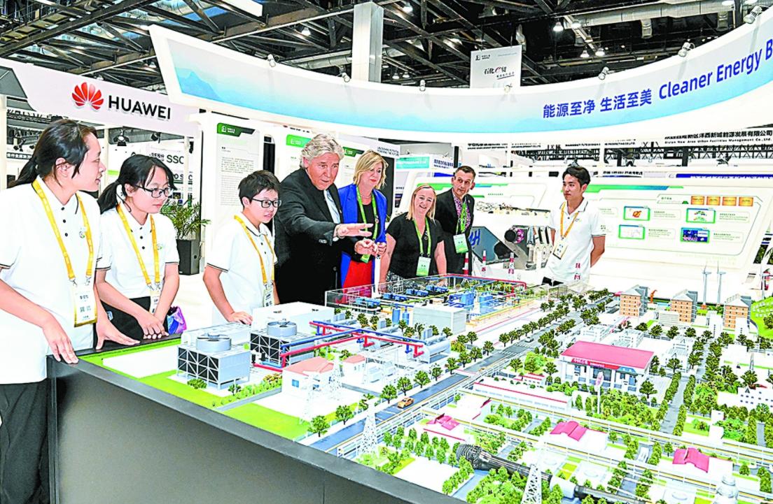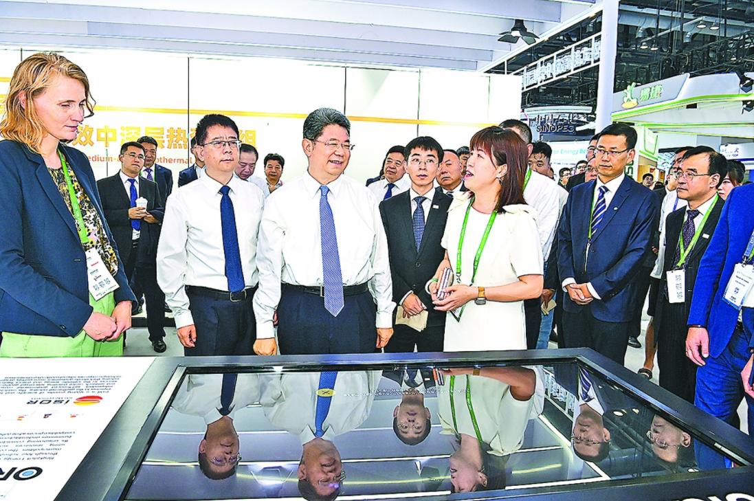 9月15日,国际地热协会主席布洛格(左四)在地热能开发技术与装备特装展览现场观看新星公司“热氢风光”新能源产业沙盘。