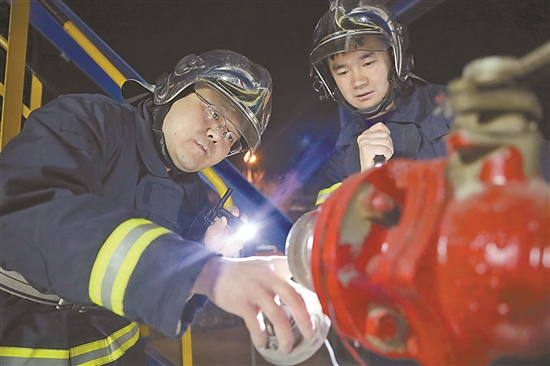 作为石化企业的专职消防队,每天3次的例行巡检必不可少。“我们巡检的重点就是每个装置前的消防设备,要检查灭火器的压力、消防栓的接口以及灭火水炮的状况。巡检的时间长了,我们对相关装置也很熟悉了,甚至还能看懂不少装置压力仪表的情况。”巡检时,消防支队三大队消防员刘峰告诉记者。