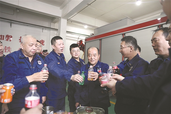 这一天,消防员沈永保也迎来了他在消防支队度过的第43个春节,从绿钢盔到橄榄绿再到火焰蓝,43年的消防战斗工作也贯穿了沈永保的整个职业生涯,今年7月他就要退休了。“谢谢大家的支持,回首这么多年,我真的很怀念和大家一起战斗的日子,我永远不会忘记和大家一起奋战的每时每刻,永远记着你们,我最亲爱的战友!”端起饮料,沈永保的声音有些哽咽,在岗和大家过的最后一个春节,让他感慨良多,“我们是一支铁打的队伍,是一个火热的集体,真的很舍不得离开。”