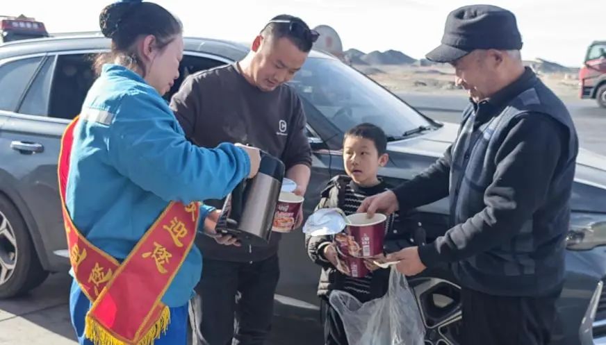 降雪天气发生后,青海油田立即组织40名志愿者前往315国道车辆拥堵路段进行交通疏导并提供帮助。