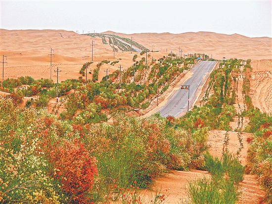 3月13日,气温渐暖,在我国首条零碳沙漠公路——塔里木沙漠公路上,一组组太阳能光伏板和436公里生态防护林“镶嵌”在茫茫沙海中,形成一道壮美景观。这里是我国最大的沙漠,号称“死亡之海”的塔克拉玛干沙漠。近年来,塔里木油田秉持“开发一个区块,建设一片绿洲,撑起一片蓝天”的原则,将绿色发展理念贯穿到油气生产全过程,利用苦咸水在沙漠大规模植树造林,在塔中油气生产区和沙漠公路沿线种植苗木,绿化面积超6.45万亩。