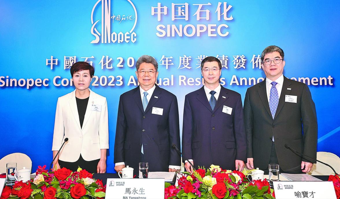 3月25日,中国石化在香港发布2023年度业绩。2023年,面对复杂经营形势和激烈市场竞争,中国石化深入实施高质量发展行动,积极发挥一体化优势,全方位优化生产经营组织,大力协同创效,油气当量产量、原油加工量、境内成品油总经销量及乙烯产量均创历史新高,经营活动现金流比上年大幅增长,取得了良好经营业绩。按照国际财务报告准则,公司全年实现营业收入3.21万亿元,公司股东应占利润为583.1亿元,每股盈利为0.487元。公司注重股东回报,预计全年派发现金股利每股0.345元(含税),加上年内回购金额,合并计算后,全年分红派息比例达到75%。股份公司董事长马永生出席业绩发布会并致辞,股份公司总裁喻宝才介绍2023年业绩概要。股份公司财务总监寿东华、股份公司副总裁兼董事会秘书黄文生出席。