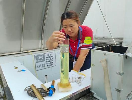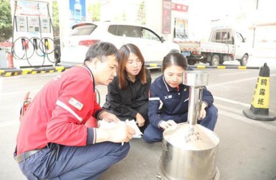 图3:贵州黔东南石油开展“世界计量日”活动,对辖区站点加油机进行精度自校,现场发放宣传手册、播放LED宣传标语、为客户答疑解惑等。图为5月15日黔东南石油施秉城关加能站计量员观察柴油质量。吴贤军摄吴毅文