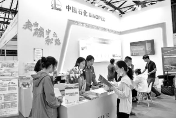 6月5日至8日,2024上海国际碳中和技术、产品与成果博览会在上海举办。上海石油携B5柴油亮相博览会,展示该公司通过对餐厨废油进行资源化再利用,实现碳减排的系列措施。图为中国石化展台吸引观众驻足。