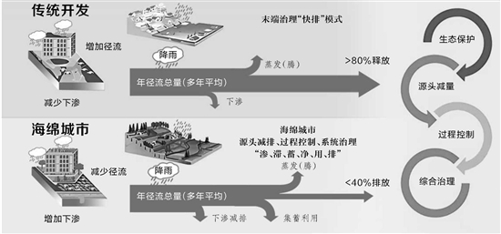 “海绵城市”与传统城市模式对比示意图