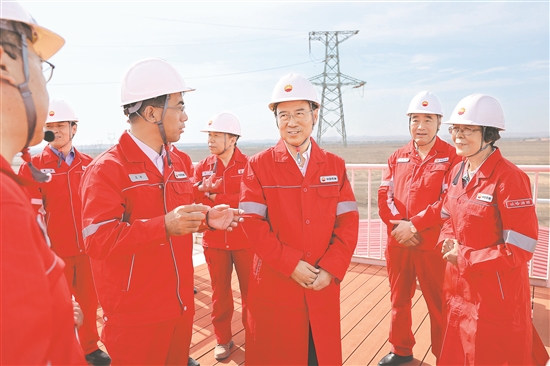 戴厚良在吐哈油田120兆瓦源网荷储一体化光伏电站了解清洁电力情况。记者 金添 摄