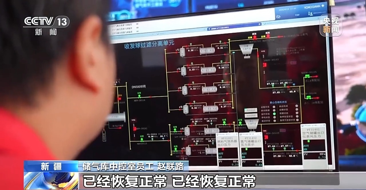 新疆油田储气库有限公司集注站副站长许鹏:我们储气库投产初期,生产数据采集与存储功能还不完善,员工需要每两小时进行一次巡检,记录我们的生产运行参数。现在运用物联网及人工智能技术以后,员工在生产指挥中心通过工控系统就可以对生产数据进行集中统一监测及远程调控。
