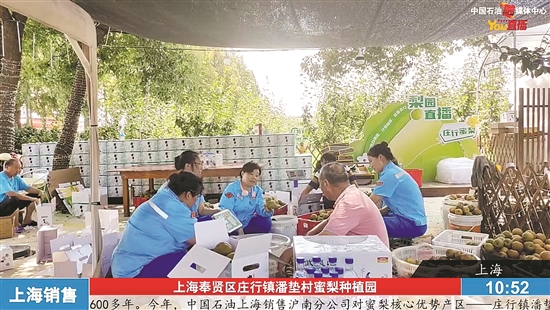 直播中,距离乌恰县5000公里外的上海奉贤区庄行镇潘垫村蜜梨种植园里,热闹非凡。这里,绿树成荫,果实累累,果农们将刚采摘下来的蜜梨进行有序分装。中国石油上海销售沪南分公司积极对接当地果农,将庄行蜜梨引入加油站便利店,让潘垫村的蜜梨走出了小村庄,不仅解决了果农的滞销难题,还让消费者在加油的同时能品尝地道的上海味道。