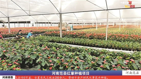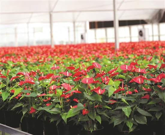 镜头中,吸引网友的还有一片惹眼的“红海”。温室大棚内,一片片翠绿中盛开着鲜艳的红掌花,宛如一幅生动的油画。这里是中国石油在河南范县援建的红掌种植基地。该基地采用现代科技精细化管理技术,实现了红掌花卉的规模化、标准化种植。目前,红掌花卉种植面积达4万平方米,年产红掌成品150万盆,不仅为当地提供了大量就业机会,还让美丽经济绽放出了新的光彩。