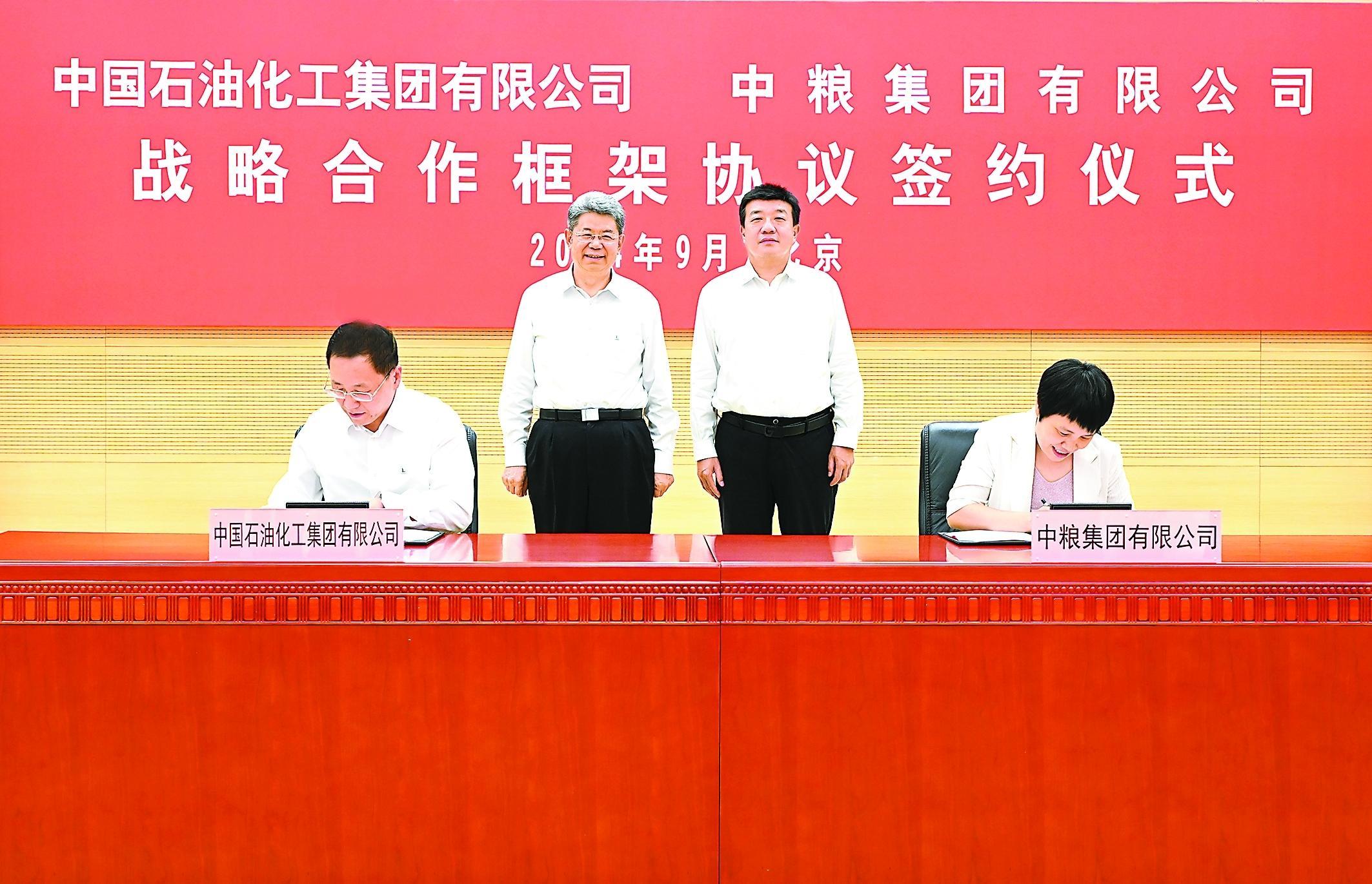本报讯记者 张炅 张千昱报道:9月2日,中国石化与中粮集团在京签署战略合作框架协议。根据协议,双方将在产品供应、供应链管理、市场营销、绿色低碳发展等领域全面深化合作。集团公司党组书记、董事长马永生与中粮集团党组书记、董事长吕军在总部会谈并一同见证签约。
