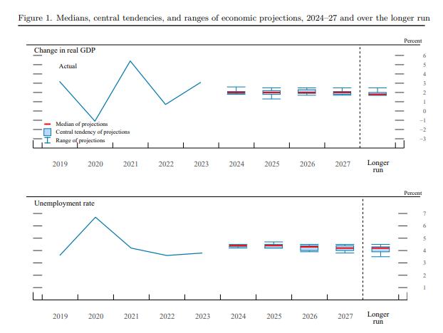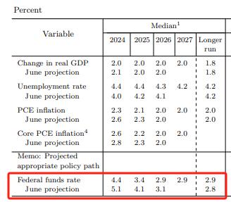 与会者们将2024年美国GDP增长预期从2.1%下调至2%,并预计未来三年的增长都将保持在这一数字,长期增速保持在1.8%不变;今年的失业率预期从4%上调至4.4%,未来三年分别为4.4%、4.3%和4.2%。