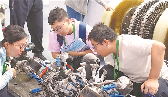 参展观众对508毫米自爬行内检测装置的细节进行观察交流。 王汐 摄