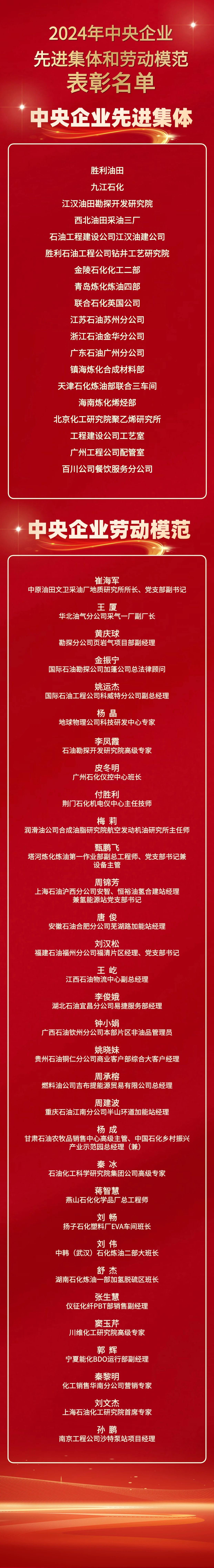 根据人力资源社会保障部、国务院国资委的表彰决定,共有491个集体被授予“中央企业先进集体”称号,792名个人被授予“中央企业劳动模范”称号。其中,胜利油田、九江石化等19个集体被授予“中央企业先进集体”称号,中原油田文卫采油厂地质研究所所长、党支部副书记崔海军等32名个人被授予“中央企业劳动模范”称号。(生动)