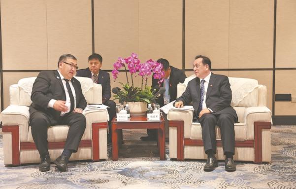 集团公司总经理侯启军(右)会见蒙古国工业与矿产资源部部长图旺。