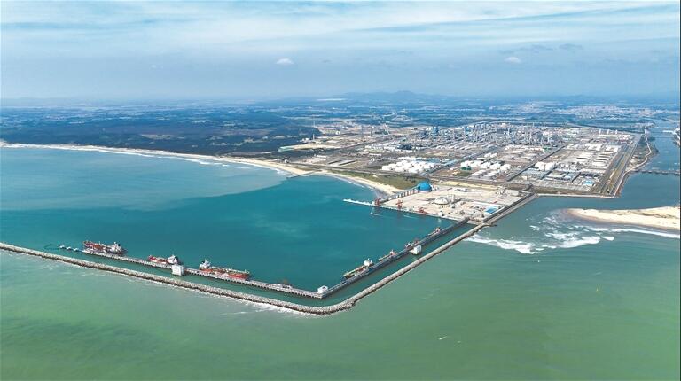 ▲南海之畔,货轮正在广东石化原油码头装载化工品。高云龙 摄