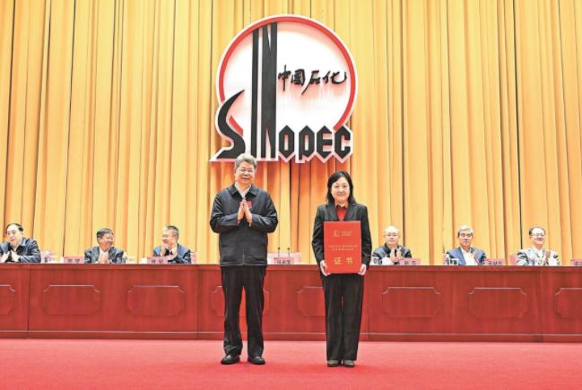 1月16日,中国石化集团公司党组书记、董事长马永生为中国石化首席专家、石油化工科学研究院科学家聂红颁发2024年度中国石化科技创新功勋奖证书。