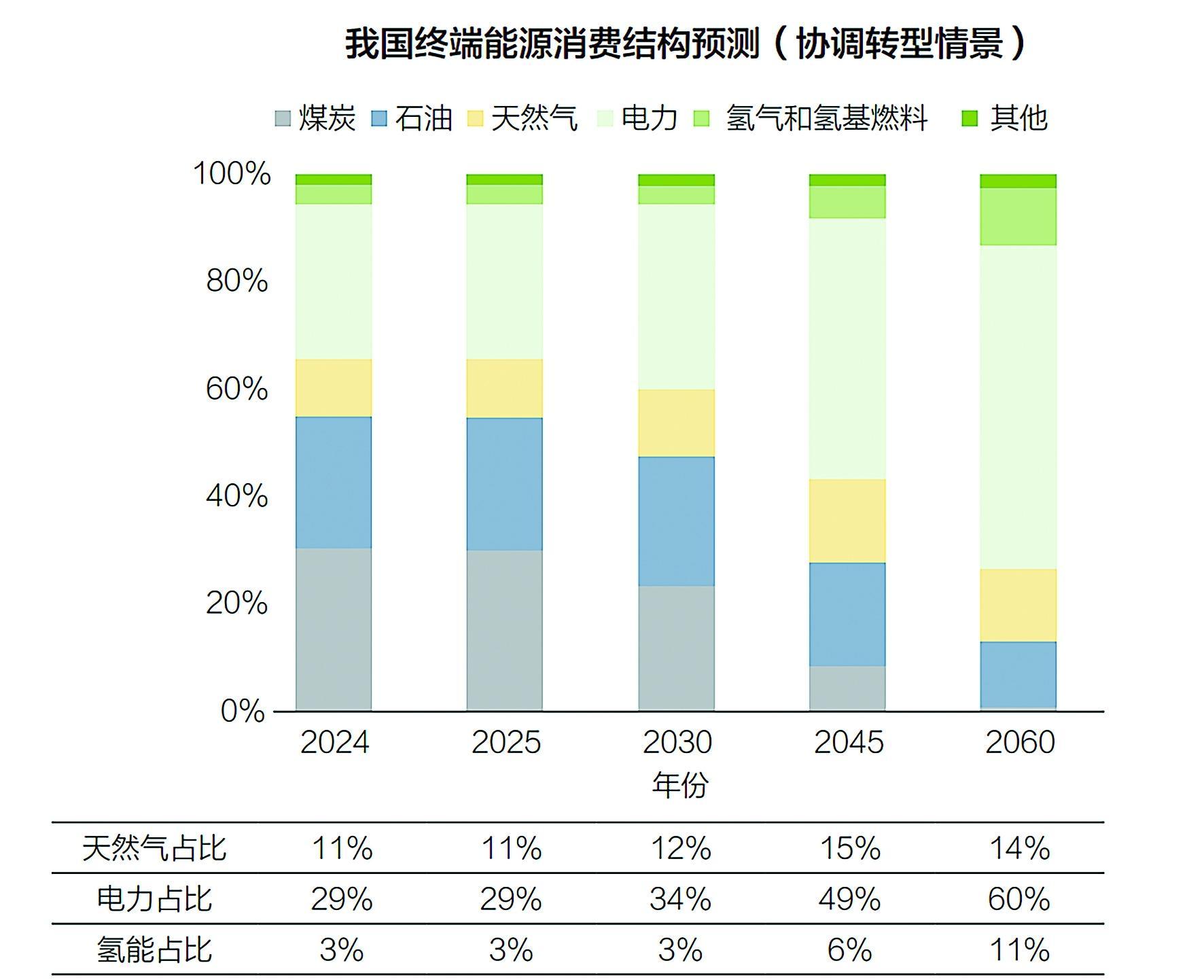 2024年,我国终端能源消费总量为42.6亿吨标准煤,比上一年增长3.8%,电气化率提升至28.5%。预计我国终端能源消费总量将于“十五五”中期进入平台期,并于2030年前后达峰,峰值在46亿吨标准煤以上,达峰阶段电力对终端能源消费总量的增长贡献率高达99.5%。到2060年,预计我国终端能源消费总量将降至31.5亿吨标准煤,届时,我国电气化率将达到60%,电氢化率将达到71%。