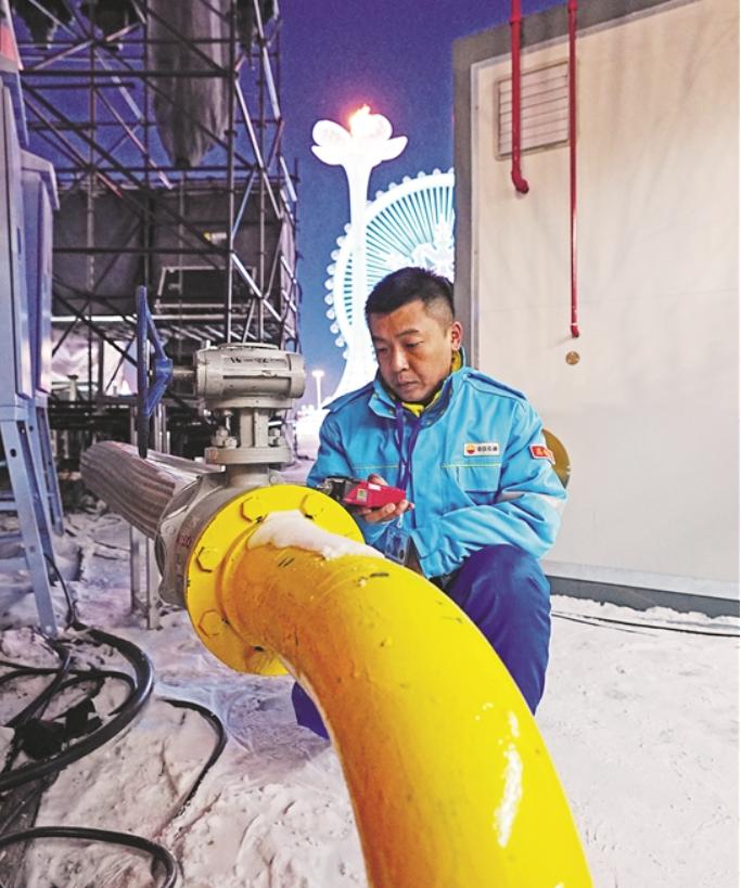 2月8日晚,气温降至零下22摄氏度,火炬保障人员对配套的调压柜、管线等进行巡检。