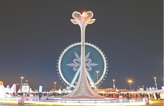 亚冬会主火炬“雪韵丁香”熊熊燃烧,与冰雪大世界夜景交相辉映。杨程 摄