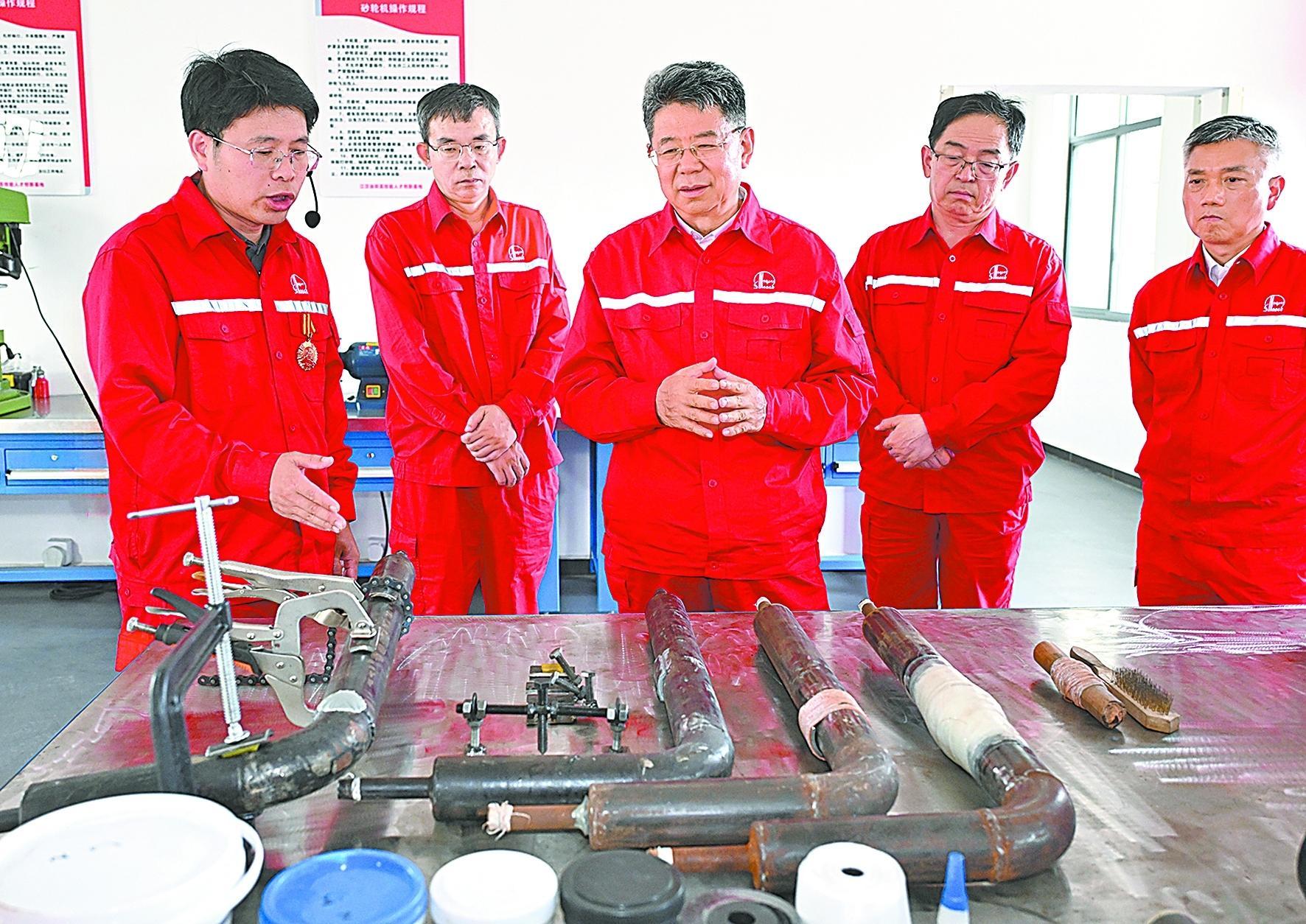 5月7日,马永生在江汉油田张义铁创新工作室联盟现场考察。程 阳 宋国梁 摄影报道
