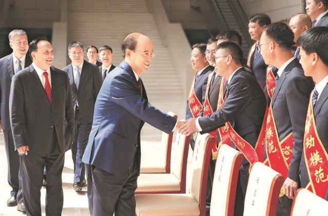 戴厚良等集团公司领导与劳动模范和模范集体代表亲切握手。