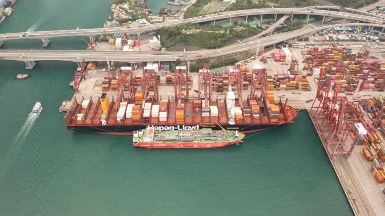 此次是香港首次在码头进行船舶液化天然气加注,也是首次开展燃料补给与货物装卸同步作业。执行加注任务的“海洋石油301”是全球最大、我国首艘液化天然气运输加注船,主要为国际航行船舶提供燃料补给,可装载3万立方米液化天然气,每小时可加注1650立方米液化天然气,作业能力位居国际前列,本次“海洋石油301”从珠海金湾“绿能港”装载燃料,经珠江口航道直抵香港,依托大湾区一体化能源供应链实现“资源返装-运输-加注”全链条无缝对接。受注船“河内快航”号大型集装箱船从马达加斯加启航,经马来西亚、新加坡等地,抵达香港葵青货柜码头,停靠24小时进行装卸货物后,前往下一个目的地高雄港。