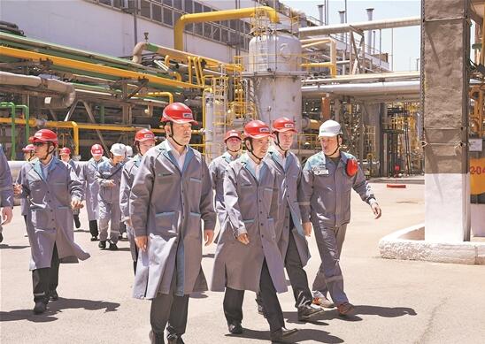 戴厚良在奇姆肯特炼厂现场调研。本报记者 李妍楠 摄