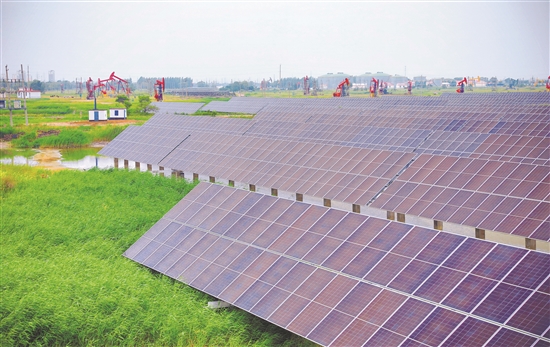 一台台风力发电机在蓝天下徐徐转动,一望无垠的光伏板如同靛青色的海洋……漫步大庆油田,立足发展“必答题”,提升覆盖“全链条”,新能源发展的“绿色”图景正绘成生机勃勃的壮美画卷。