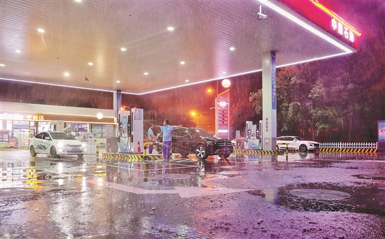 7月29日0时,北京销售南湖加油站员工冒雨为顾客服务。张旭 摄