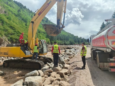 图为8月10日,甘肃石油员工在榆中县马坡乡为抢险救援机械设备加油。 白继学 摄