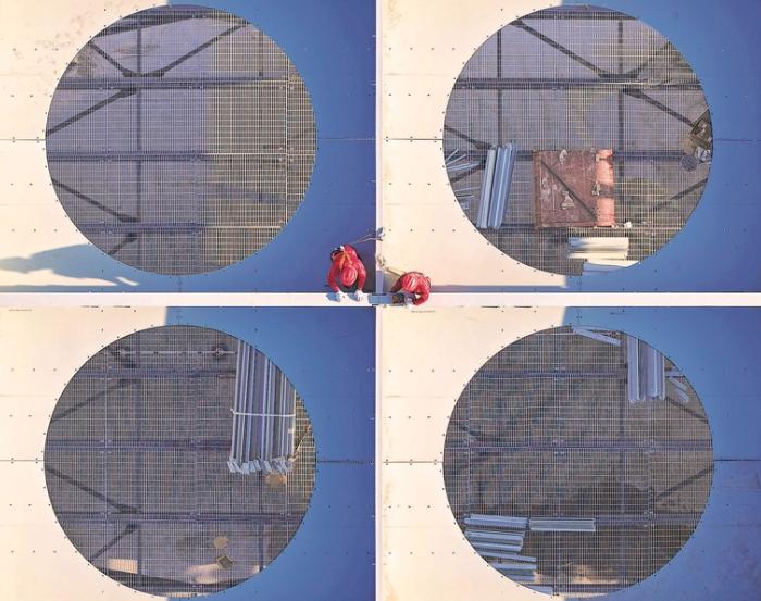 图为施工人员进行空冷器护板安装。
