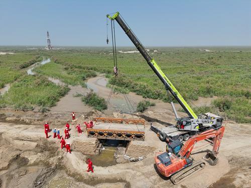 面对水流冲击带来的突发情况,工程服务中心投入665台(班)挖掘机及运输车辆、铲车等设备,全天候保运。在TH12504等井场道路架设钢架桥疏导泄洪,累计封堵渠道缺口32处,加固溢流风险点85处次。