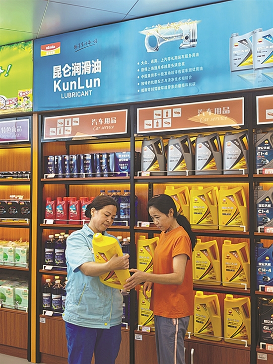 郴州汝城新城第二加油站员工向客户介绍润滑油。蒋群 摄