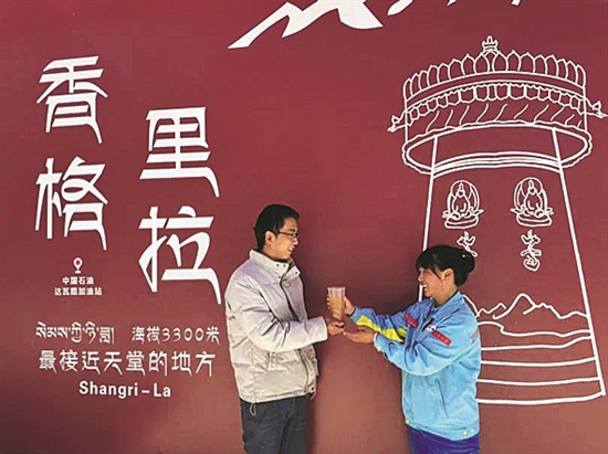 迪庆独克宗综合能源站员工为顾客递上酥油茶。桂红健 摄