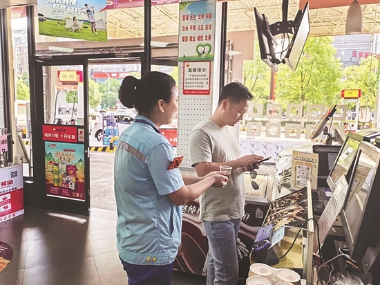 郴州西河加油站员工向客户提供周边旅游信息。范红艳 摄