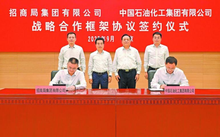 9月4日,中国石化与招商局集团在总部签署战略合作框架协议,集团公司董事长、党组书记侯启军与招商局集团董事长、党委书记缪建民进行会谈并见证签约。