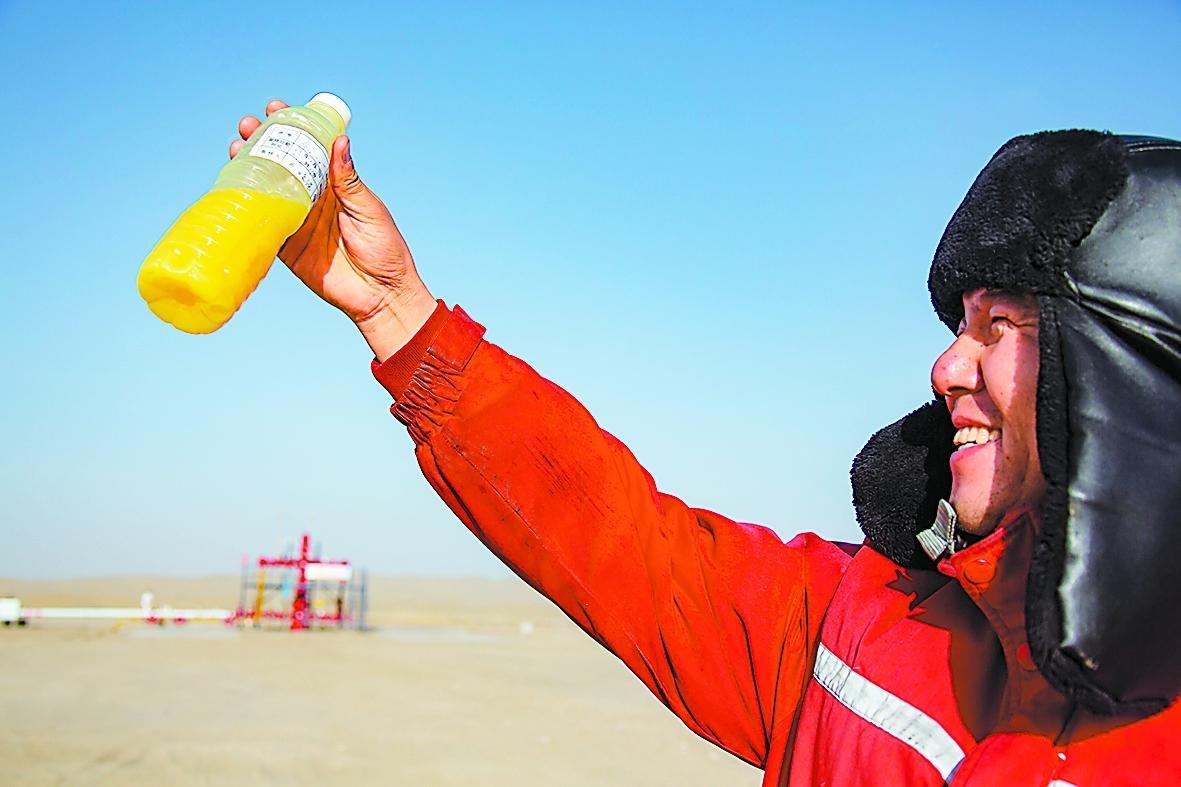 “深地一号”顺北油气田“尖刀”班员工展示原油样品。李学仁 摄