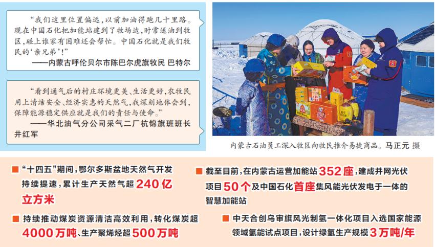 “十四五”以来,中国石化深入贯彻落实习近平总书记重要指示精神,牢牢把握党中央对内蒙古自治区的战略定位,将企业高质量发展与自治区现代化建设深度融合,紧紧围绕保障能源安全、推动绿色转型、增进民生福祉持续发力,以实干担当助力书写中国式现代化内蒙古新篇章。